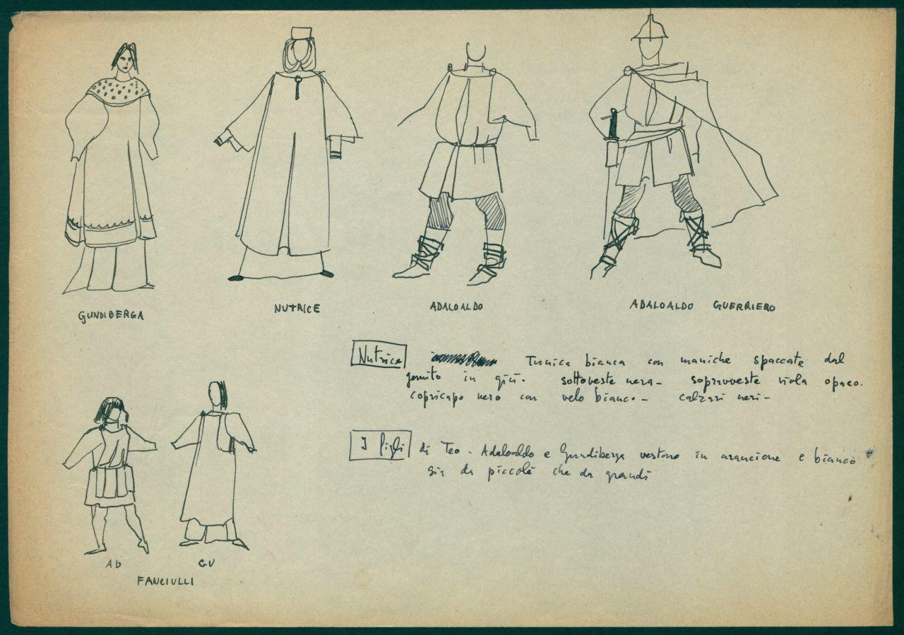 Figurini per costume di scena dello spettacolo" La leggenda di Flavia Teodelinda". costume per Gundiberga, nutrice, Adaloaldo e fanciulli