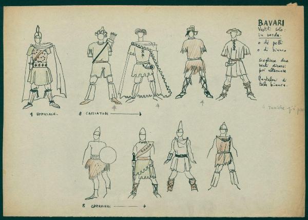Figurini per costume di scena dello spettacolo" La leggenda di Flavia Teodelinda". costume per ufficiale, cacciatori e guerrieri bavari