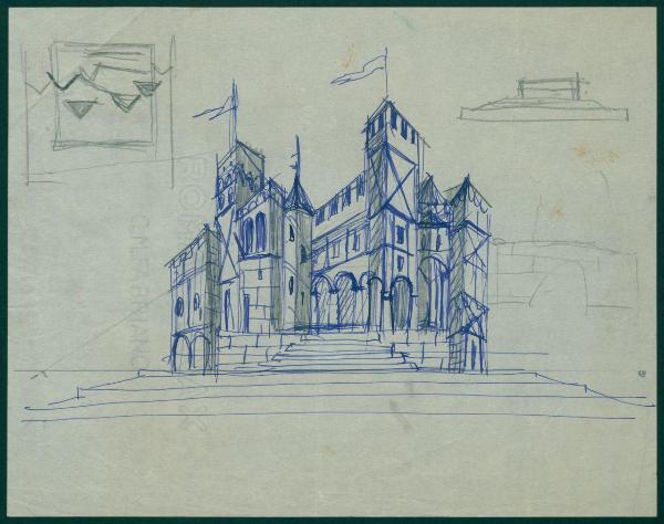 Figurini per costume di scena dello spettacolo" La leggenda di Flavia Teodelinda". architettura per scenografia: castello