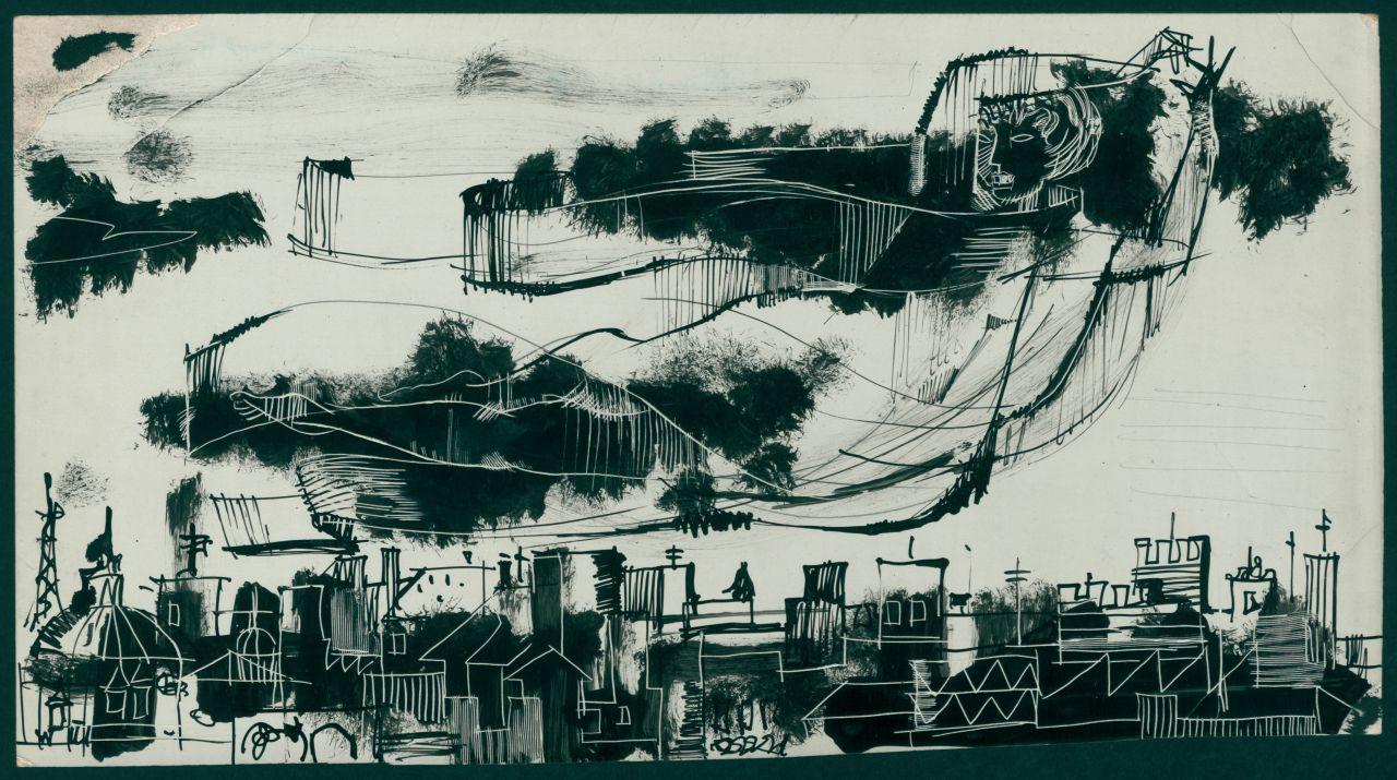 Disegno in bianco e nero eseguito con inchiostro di china su foglio di carta gesso.