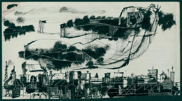 Bozzetto per pannello stand Rai - Radiotelevisione Italiana alla XX Mostra della Radio e della Televisione. allegoria della comunicazione sulla città