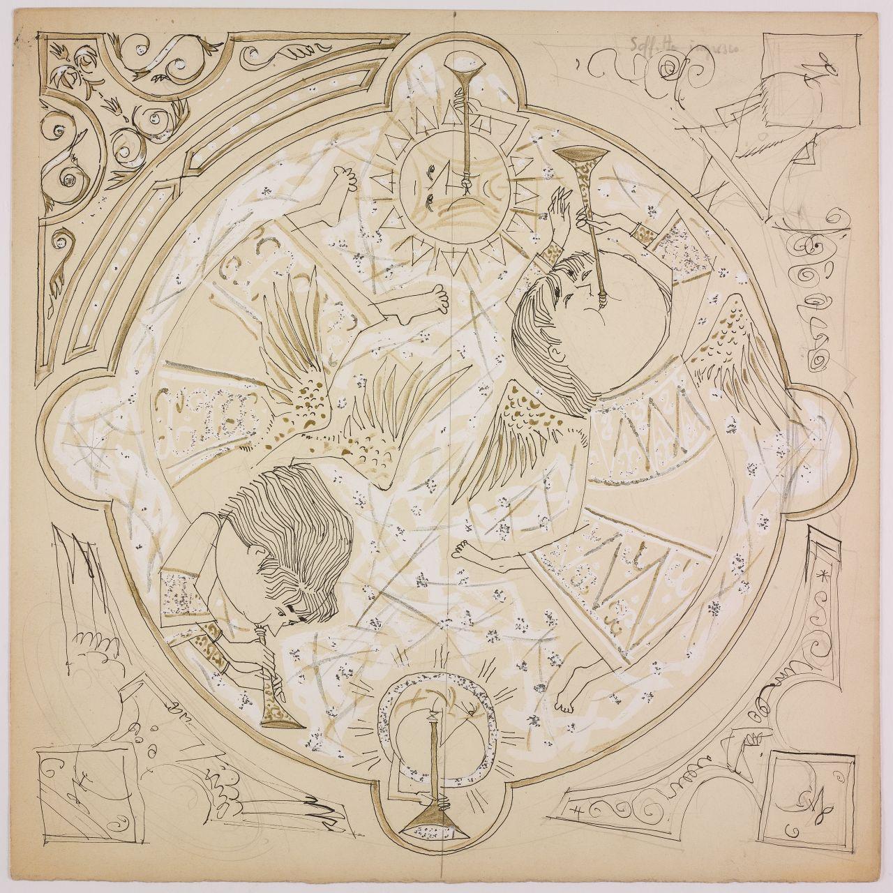 Bozzetto per l'allestimento di Natale ai grandi magazzini la Rinascente. decorazione con angeli, sole e luna musicanti