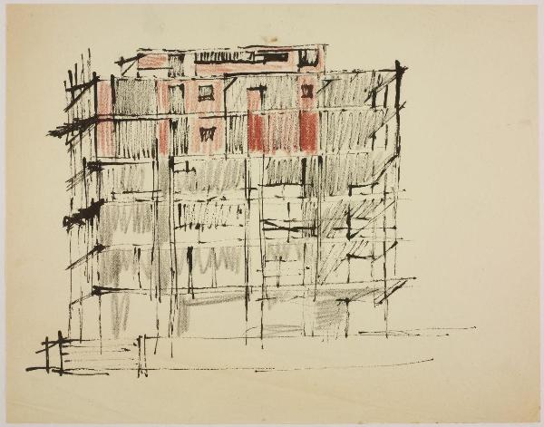 - NOTIZIE STORICO CRITICHE Nel gennaio 1958 Giancarlo Iliprandi espone i suoi dipinti della serie Case e cantieri alla Galleria dell'Ariete a Milano per cui viene pubblicato il ventinovesimo catalogo della Galleria con testo dell'amico e collega pittore Emilio Tadini. La pittura di Iliprandi registrava la rinascita e l'espansione urbanistica della Milano dell'immediato secondo dopoguerra, che Iliprandi segue con interesse, soprattutto riguardo la zona dove abita (via Ampere 55) allora interessata dal cantiere della nuova Facoltà di Architettura così come del palazzo di Gio Ponti in via Vallazze 63 dove il giovane acquista un appartamento e si trasferisce nel dicembre 1957.