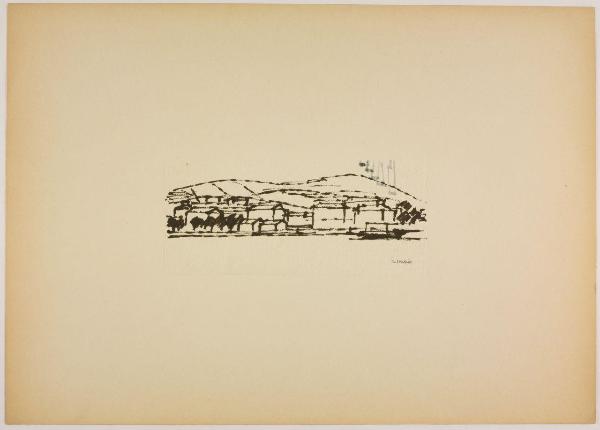 Disegno in bianco e nero eseguito con inchiostro di china su foglio di carta di riso montato su cartoncino.