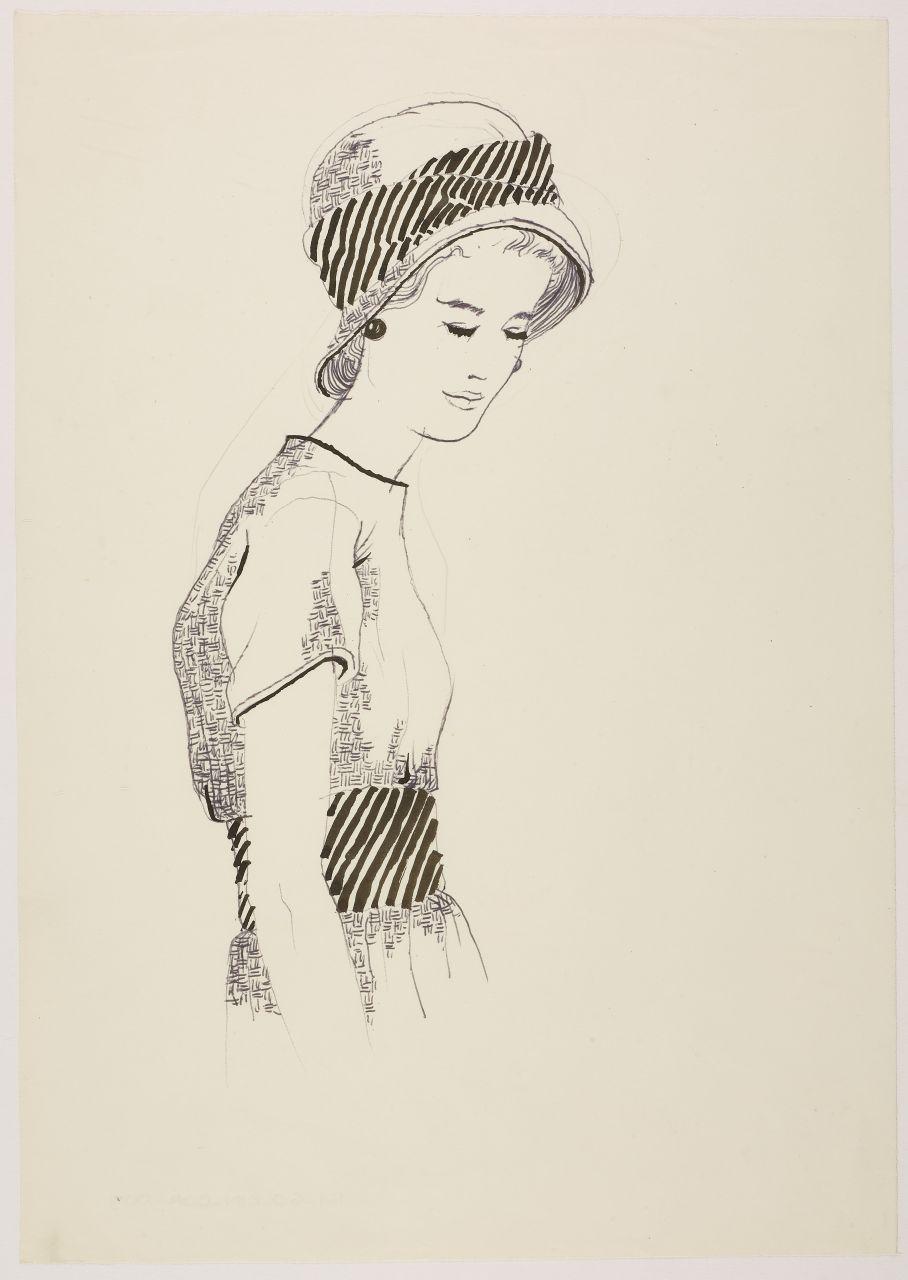 Bozzetto per il reparto Donna Moda femminile dei grandi magazzini la Rinascente. donna con abito e cappello coordinati