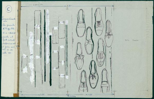 Bozzetto per pannello del reparto Uomo Moda maschile dei grandi magazzini la Rinascente. scarpe da uomo di modelli differenti