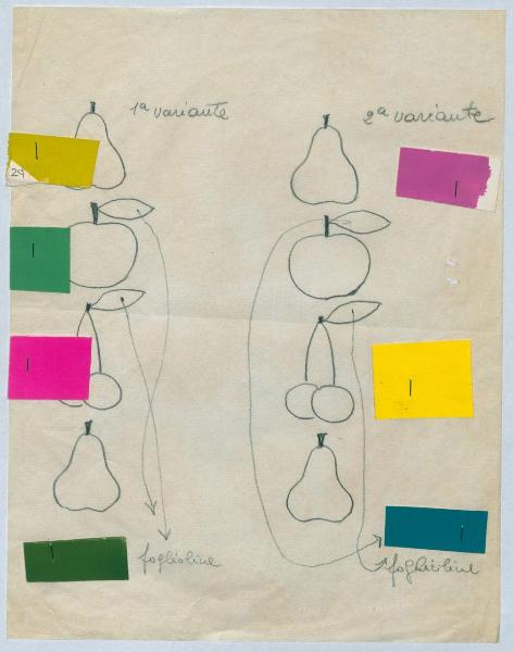 Varianti di soggetti per tappezzeria a tema frutta per i grandi magazzini la Rinascente. varianti di mele e pere con campioni colore