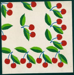 Disegno per tappezzeria a tema natura per i grandi magazzini de la Rinascente. ciliegie e foglie