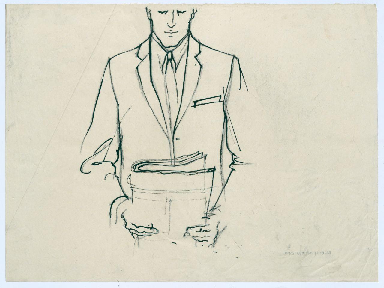 Bozzetto di moda maschile per i grandi magazzini la Rinascente. uomo con giacca monopetto e giornale