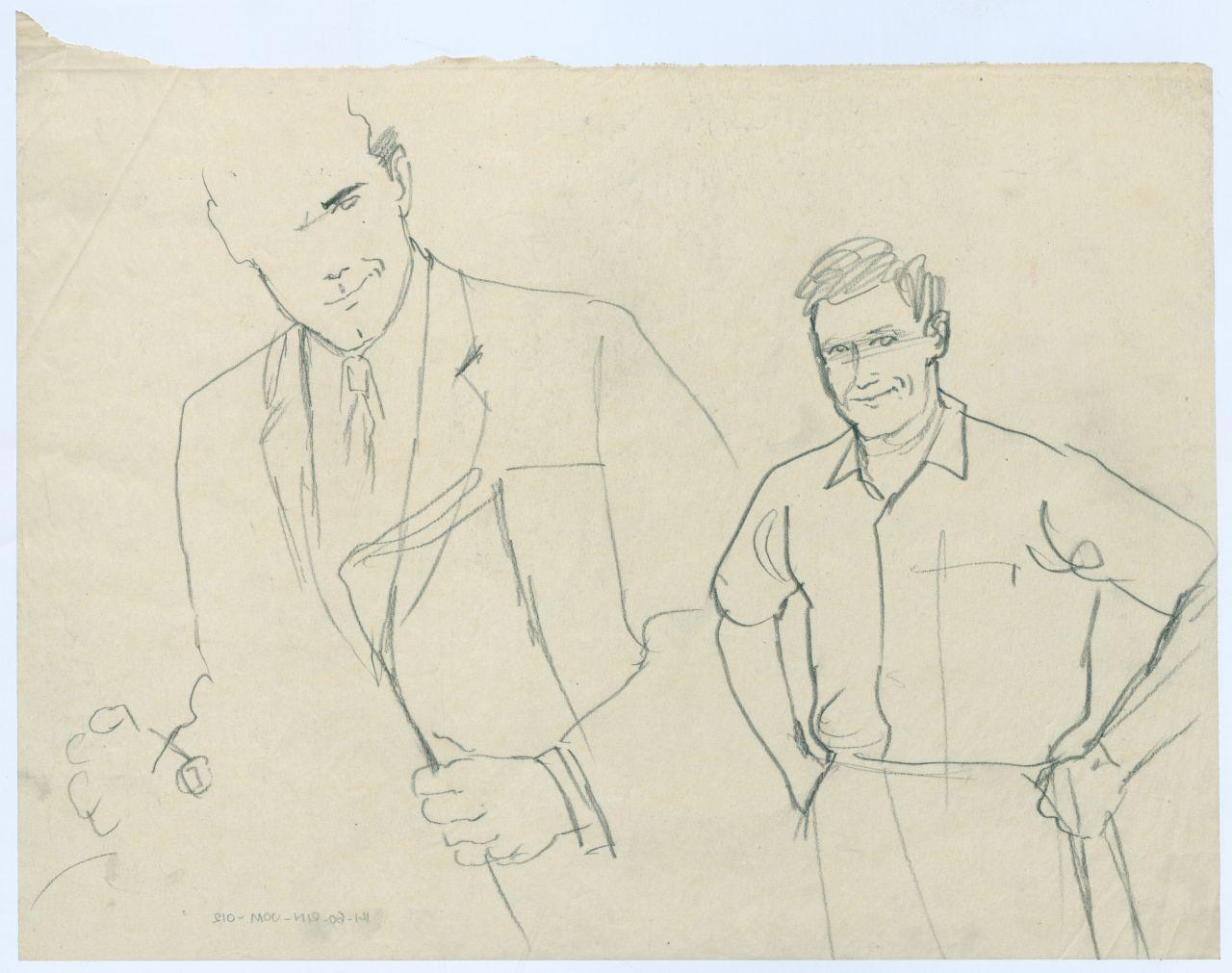 Bozzetto di moda maschile per i grandi magazzini la Rinascente. uomo con giacca monopetto e giornale e uomo in camicia