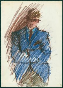 Bozzetto di moda maschile per i grandi magazzini la Rinascente. uomo con giacca monopetto