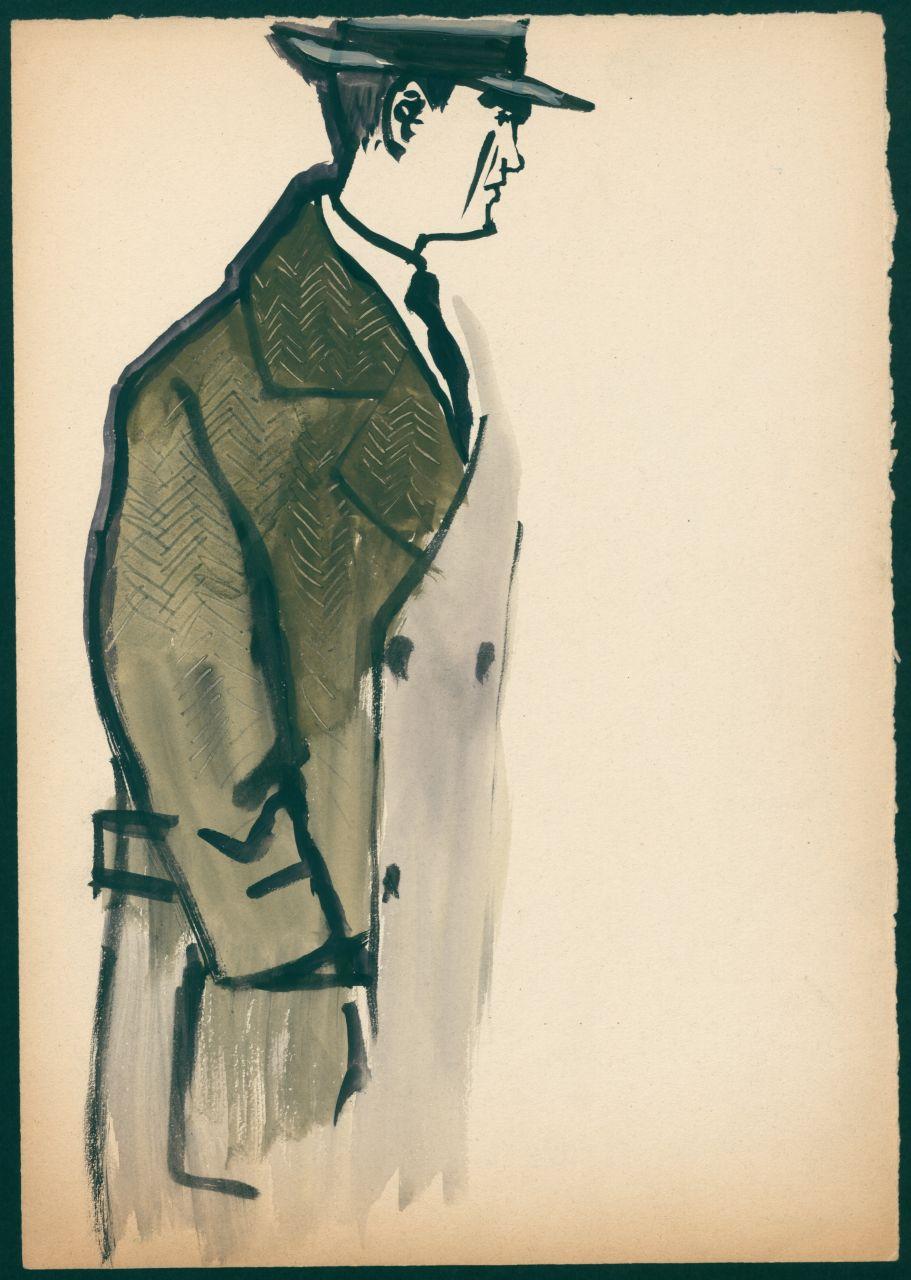 Bozzetto di moda maschile per i grandi magazzini la Rinascente. uomo con soprabito doppiopetto e cappello tipo Borsalino