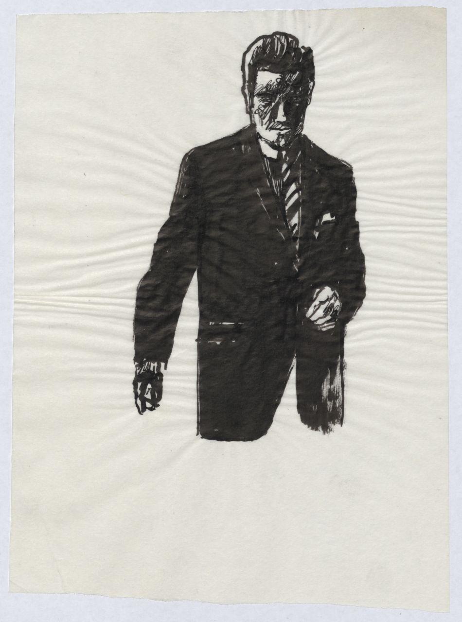 Bozzetto di moda maschile per i grandi magazzini la Rinascente. uomo con giacca monopetto e cravatta regimental
