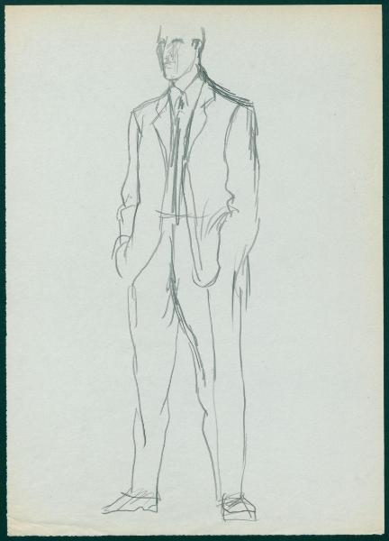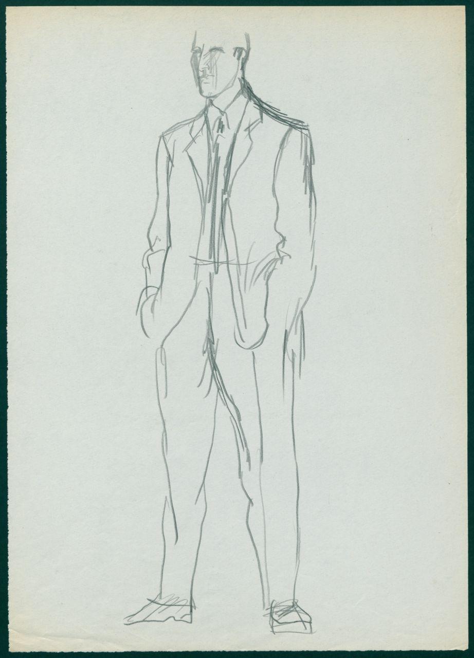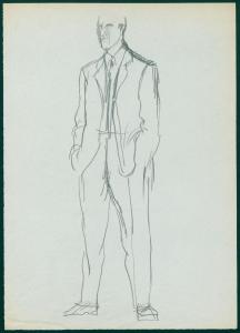 Bozzetto di moda maschile per i grandi magazzini la Rinascente. uomo con completo con giacca monopetto