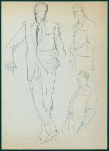 Bozzetto di moda maschile per i grandi magazzini la Rinascente. uomini con completo e giacche monopetto