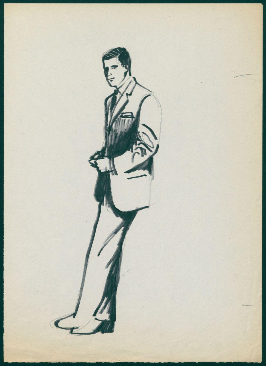 Bozzetto di moda maschile per i grandi magazzini la Rinascente. uomo con completo con giacca monopetto