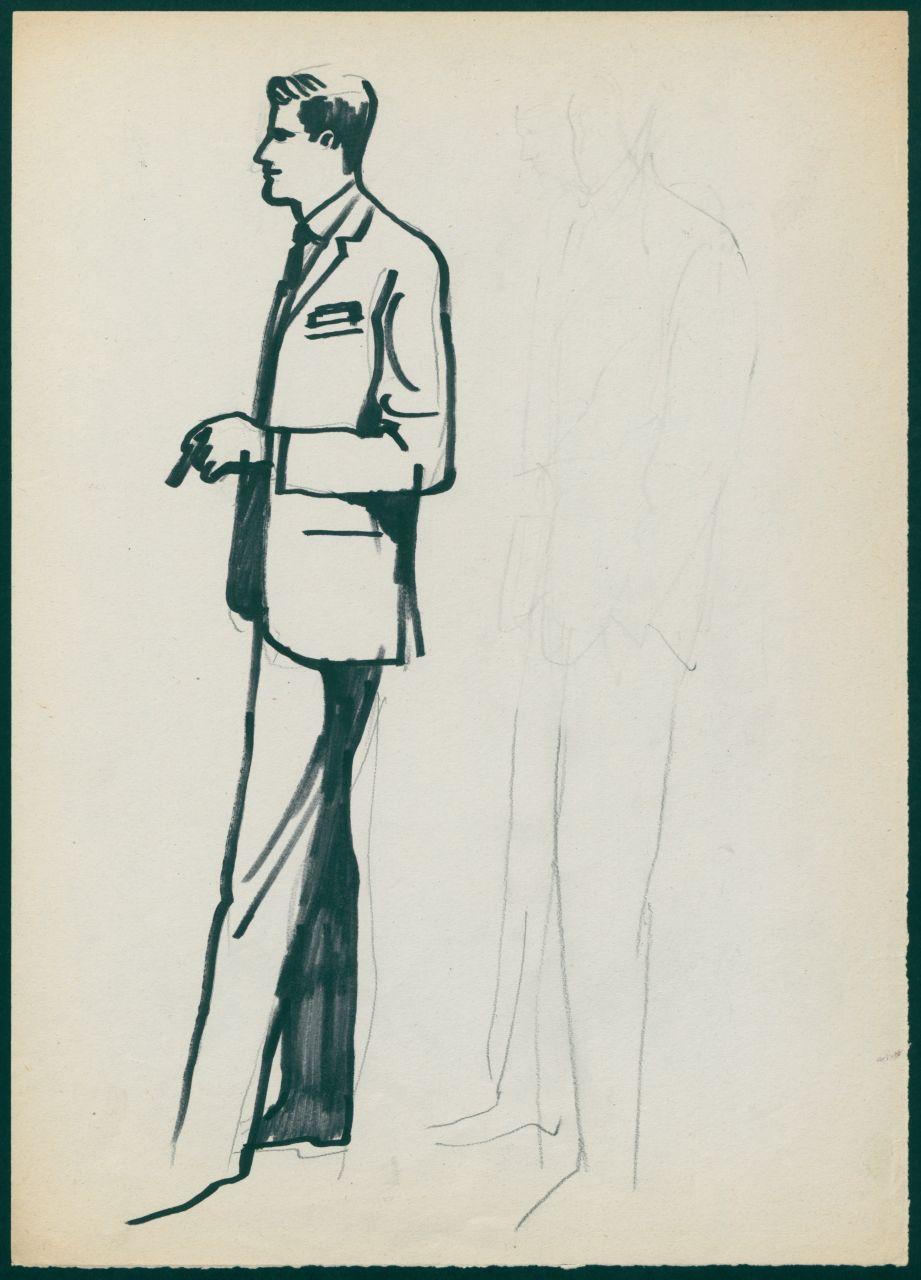 Bozzetto di moda maschile per i grandi magazzini la Rinascente. uomo con completo con giacca monopetto e sigaretta