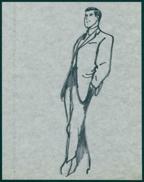 Bozzetto di moda maschile per i grandi magazzini la Rinascente. uomo con completo con giacca monopetto