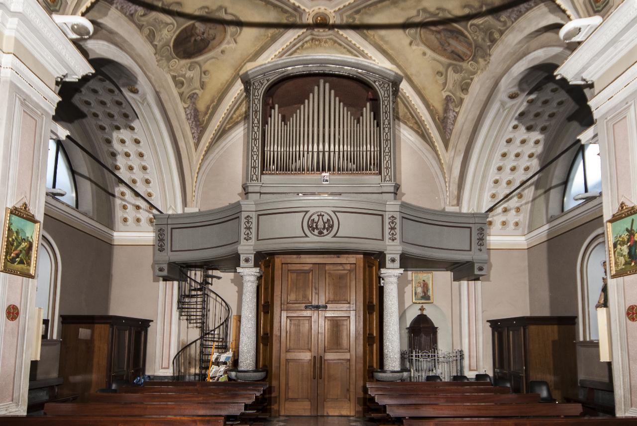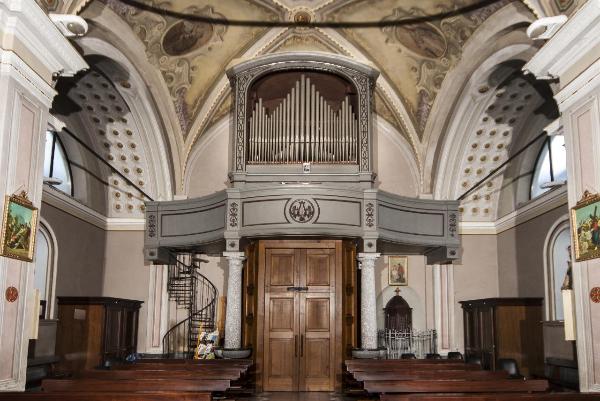 • NOTIZIE STORICO CRITICHE La tribuna da organo della Chiesa di S. Pietro a Cataeggio di Val Masino venne fatta costruire dal parroco don Luigi Casacca in occasione della installazione dell’organo, nel 1866.Come la cassa, la tribuna è in legno d'abete dipinto di grigio, decorato con applicazioni lignee che ingentiliscono l’opera. Essa consta di tre corpi, profilati da cornicette in legno e uniti tra loro da pilastrini ornati da motivi volutiformi. Il corpo centrale, poggiante su due colonne in serizzo poste ai lati della bussola della porta di ingresso alla chiesa, si presenta leggermente convesso ed è ornato al centro da una decorazione raffigurante una lira tra motivi fitomorfi. I due corpi laterali presentano lieve curvatura concava. Si accede alla tribuna mediante una scala a chiocciola in ghisa posta, entrando, a destra della porta di accesso alla chiesa.\n