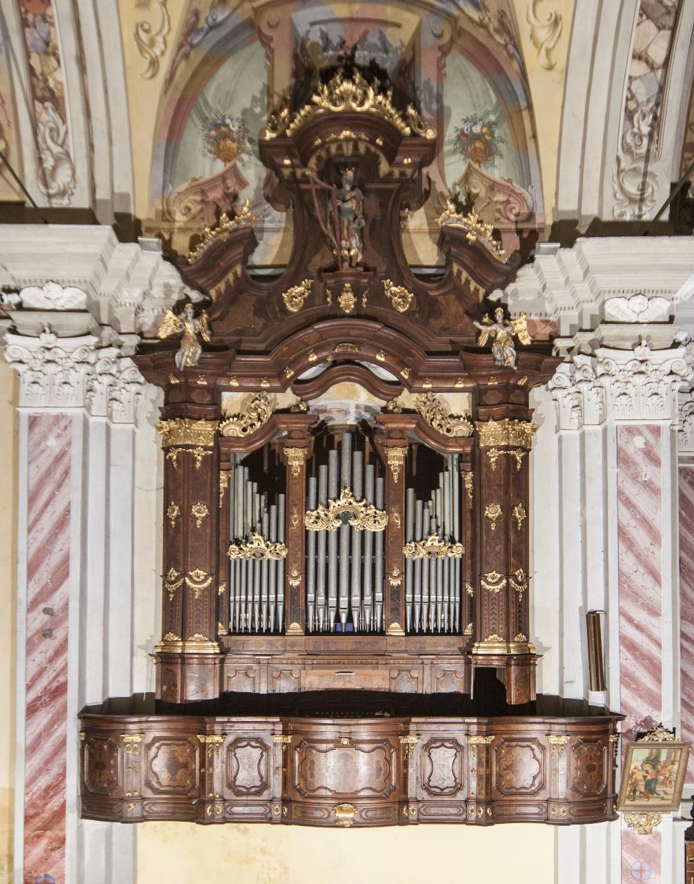 Cassa d'organo in legno di noce modanato, scolpito, intagliato, intarsiato in radica di noce, dorato e dipinto