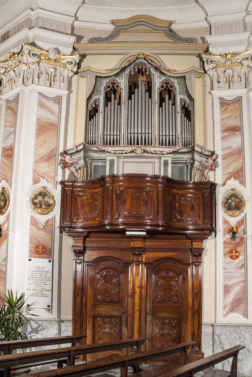 - NOTIZIE STORICO CRITICHE La tribuna da organo della Chiesa di S. Benigno de' Medici a Monastero in Berbenno di Valtellina è collocata sopra la porta laterale destra. Venne costruita nel 1781 da Giovanni Battista Scotti, insieme a pulpito e bussola. Realizzata in legno di noce sagomato, modanato e intarsiato, la tribuna è suddivisa in tre corpi, di cui quello centrale avanzato, con parapetto a sezione curvilinea. Ciascun corpo è ornato da una specchiatura a contorno mistilineo. Intarsi fitomorfi e volutiformi in bosso sono inseriti sia a livello delle tre specchiature che nelle false lesene che le separano le une dalle altre. Il corrimano e lo zoccolo sono finemente modanati.\n\n\n