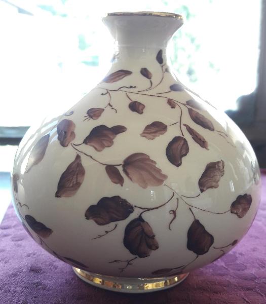Vasetto tondo in ceramica con profilature dorate, decorato con delicati motivi vegetali.