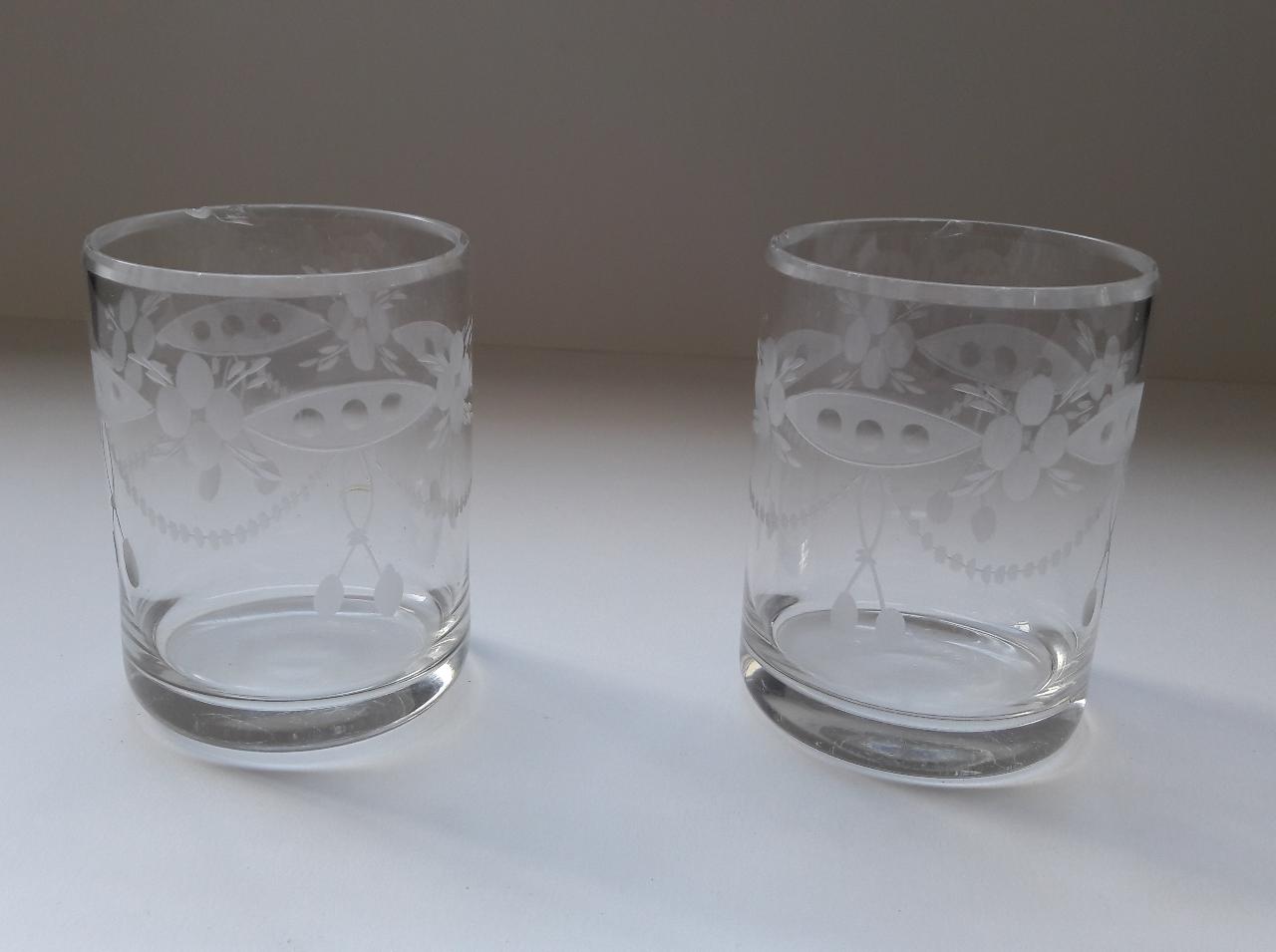 Serie di cinque bicchieri in cristallo molato ornati con motivi decorativi vegetali collegati da ghirlande.