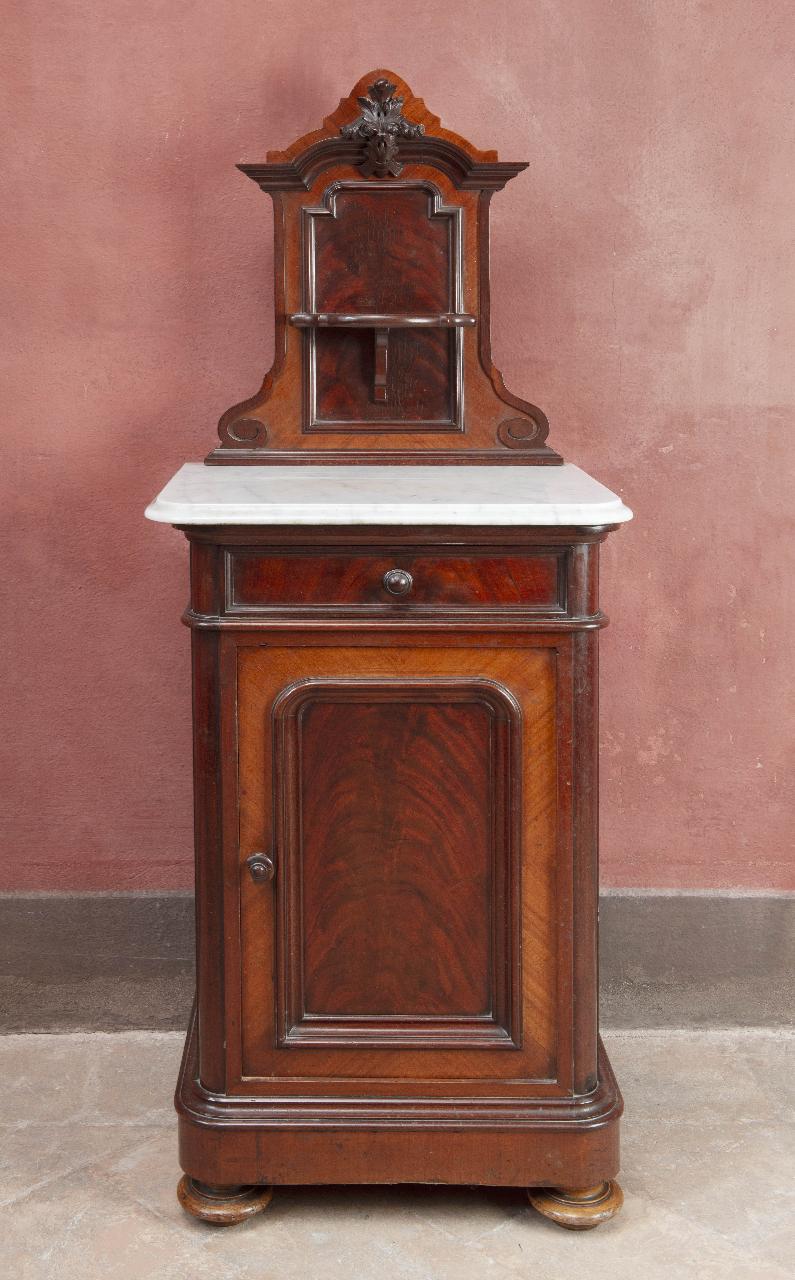 Coppia di comodini dell'epoca umbertina in legno di noce massiccio con impiallacciatura in mogano. Retti da piedi torniti a cipolla, presentano sul fronte anta e cassetto impiallacciati con cornicetta, due ripiani interni. Piano modanato in marmo, pomelli in legno tornito. Alzatina sagomata con ripiano, cornicetta e profilature, motivi decorativi vegetali intagliati nella cimasa.