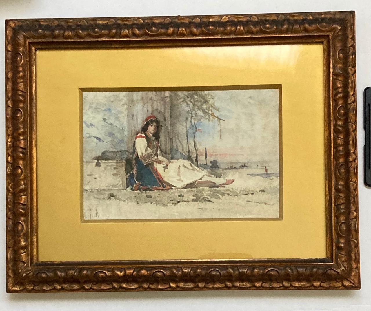 Disegno eseguito ad acquerello. Raffigura una figura di donna sdraiata con abiti tradizionali del territorio; sullo sfondo, scorcio di paesaggio. Contrasti tra luci e ombre, tra tonalità calde e fredde di colore.\nPresenta un passe-partout dorato e un cartone acido di chiusura.\nL'opera è inserita in cornice in legno modanato e dorato.