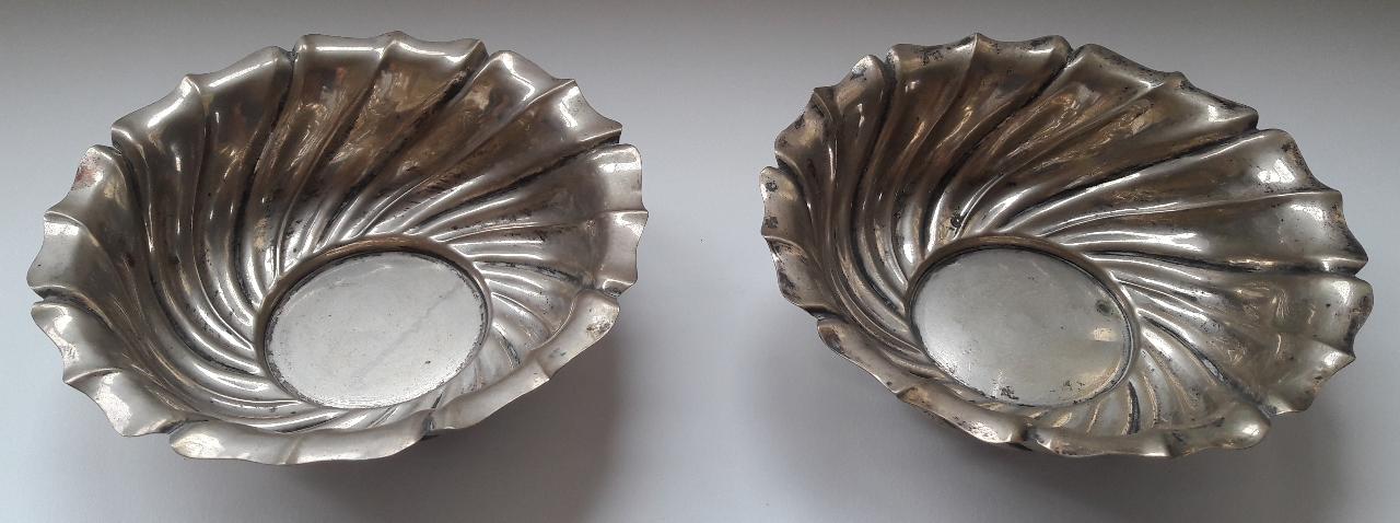 Coppia di due ciotoline in lamina d'argento sbalzata con lavorazione a torchon.