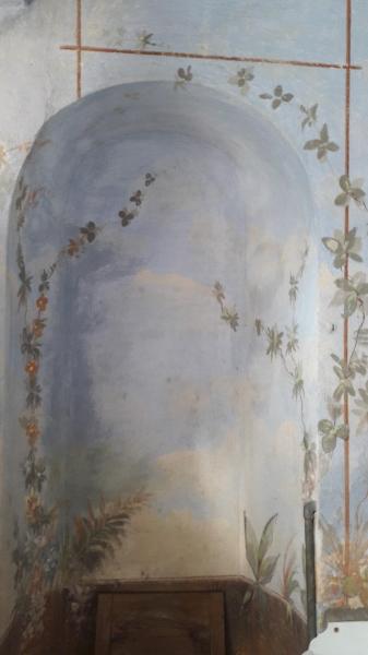 - NOTIZIE STORICO CRITICHE Si tratta di una decorazione tipica delle case borghesi di campagna, con un carattere elegante e rustico allo stesso tempo.\n\nIl restauro delle parti decorative interne dipinte ha seguito un criterio molto conservativo: il degrado delle superfici non è stato completamente eliminato ma bloccato con il trattamento minimo delle pareti, che hanno mantenuto la patina del tempo.