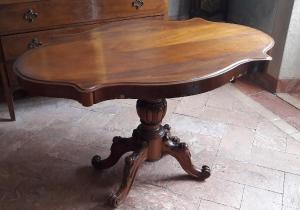 Tavolo retto da balaustro tornito terminante con gambe mosse intagliate con motivi a rocaille. Piano sagomato a biscotto con fascia sottostante impiallacciata in radica di noce.