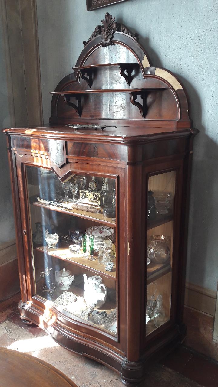 Vetrina con alzata formata da due ripiani sostenuti da riccioli intagliati, cimasa sagomata con doppia cornice ed elemento decorativo vegetale superiore a intaglio; vetrina sottostante con fronte leggermente mosso recante un'anta vetrata così come i fianchi. Montanti modanati, piedi torniti a cipolla.