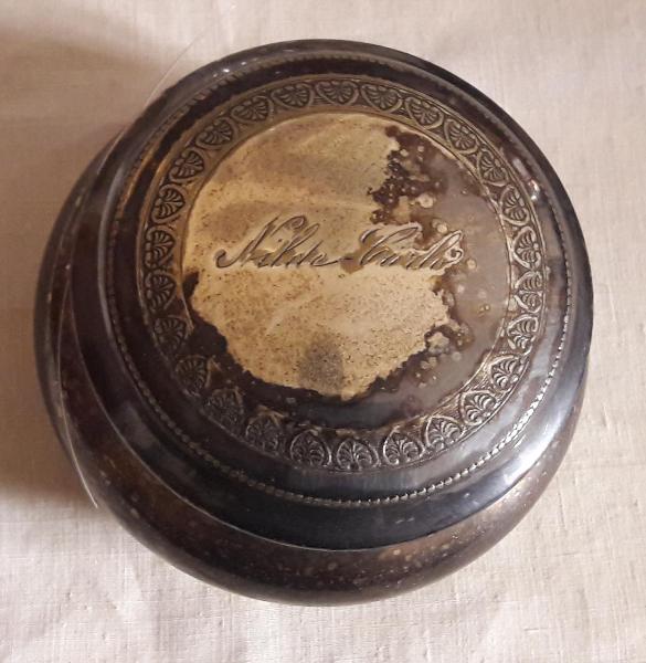 Scatola con coperchio ornato con fascia decorativa a palmette stilizzate, al centro incisi i nomi degli sposi, Carlo e Nilde; bordo esterno con motivo a perline.