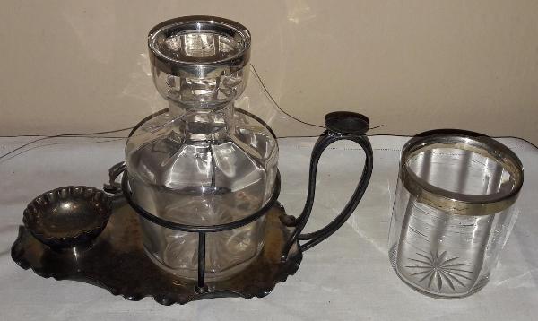 Servizio da notte: struttura portante in metallo fuso e argentato a forma di vassoio sagomato con bordo smerlato, manico ad orecchio, piccolo contenitore con bordo smerlato fissato al vassoio mediante un perno, supporto per contenere la bottiglia in cristallo molato e inciso. Bicchiere con bordo superiore in lamina di metallo argentato.\n