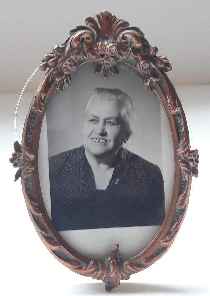 - NOTIZIE STORICO CRITICHE Il manufatto in base allo stile decorativo risale all'epoca Liberty.\nAll'interno del portafoto, fotografia in bianco e nero di Leonilde Anna Caterina Monti (1897-1979) di Borgomanero, mamma di Maria Luisa Macchi, ripresa in età anziana.