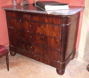 Cassettone impiallacciato in mogano sorretto da piedini torniti; sul fronte presenta tre cassetti più uno nella fascia del sottopiano, montanti modanati; piano in marmo stondato.