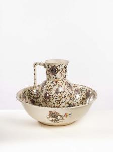 Catino con brocca da toeletta di grandi dimensioni in ceramica ornati con motivi decorativi floreali e vegetali stilizzati realizzati con la tecnica della decalcomania con ritocchi di colore e dorature fatte a mano.\n\n
