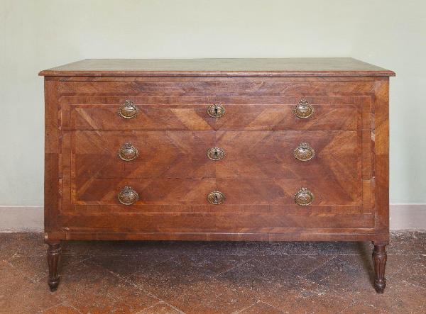 Cassettone impiallacciato e intarsiato; fronte a tre cassetti intarsiati e fianchi inquadrati da cornici geometriche intarsiate. Gambe tornite e scanalate, ferramenta in ottone.