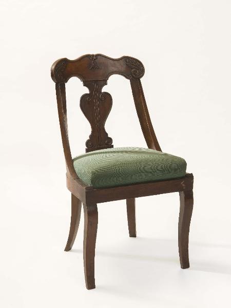Gruppo di quattro sedie a gondola con schienale a giorno con cartelle centrali sagomate e abbellite da motivi decorativi a ricciolo e vegetali intagliati. Elementi fogliacei e a ricciolo resi a intagliato si trovano anche lungo la traversa dello schienale. Gambe anteriori sagomate, a sciabola quelle posteriori; seduta imbottita ricoperta da tessuto in cotone pesante di color verde.