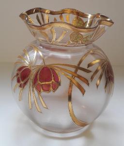 Vaso in vetro satinato con base circolare e bordo superiore smerlato, decori policromi e dorati dipinti a mano.