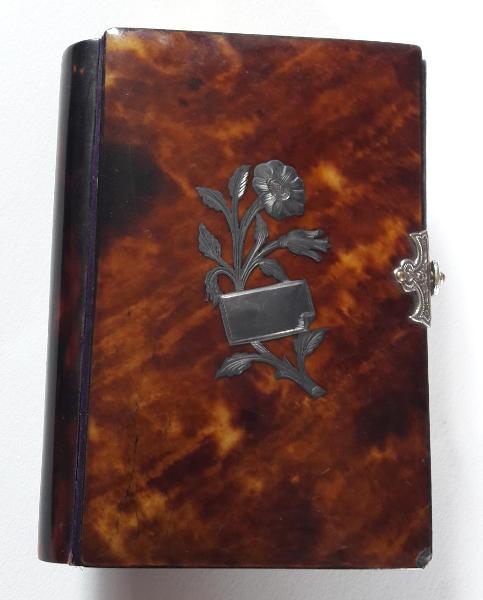 Coperta di libro liturgico in tartaruga, sul fronte inserto in lamina d'argento con motivo decorativo floreale e cartiglio, chiusura in metallo col motivo del monogramma mariano; internamente presenta un rivestimento in seta di colore viola. \nRacchiude il "Manuale delle feste contenente le epistole e i vangeli - L'Ordinario della Messa il Vespro e la Compieta, ecc." - Milano, P. Clerc Editore - Via Disciplini, 7 - anno 1884. \n