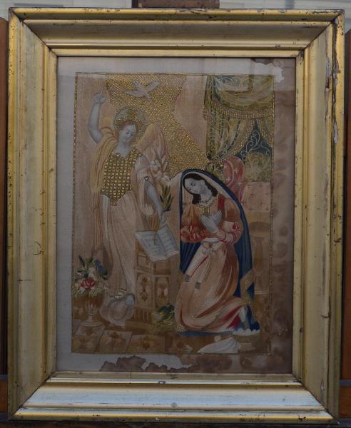 L’opera è di tipo polimaterico ed è costituita da un tessuto in seta dipinto e ricamato con fili di diverso colore e dorati, montato su cartoncino, inserito in una cornice in legno modanato e dorato.\nContrasti tra luci e ombre, effetti cangianti e di preziosità per i materiali utilizzati e per il ricco apparato ornamentale.
