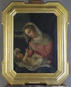 Dipinto realizzato a olio su tela, montato su telaio ligneo fisso, inserito in una cornice in legno modanato e dorato.\nRaffigura una tenera e dolce conversazione muta tra la Madonna e Gesù Bambino, disteso sulle ginocchia della Vergine Maria, con le braccia aperte protese verso l'alto; la Vergine chinata sul bimbo ha le mani giunte in segno di preghiera. Lo sfondo, scuro e compatto, è interrotto sulla sinistra da una finestra dalla quale si vede il paesaggio circostante che si perde all'orizzonte.\nI contrasti tra le luci e le ombre sottolineano e definiscono i vari volumi; traspare dai volti una ricerca di introspezione psicologica profonda e mistica.