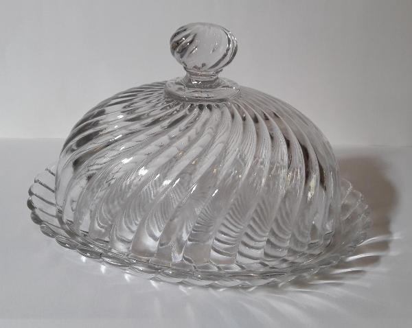 Cupola poggiante su un vassoio ovale in cristallo molato e sfaccettato con lavorazione a torchon.