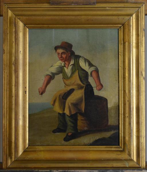 Dipinto realizzato a olio su tela, posato su cartoncino, inserito in una semplice cornice in legno modanato e dorato.\nRaffigura in primo piano la figura di un calzolaio con cappello in testa, lo sguardo rivolto verso sinistra, seduto su un ceppo di legno con gli strumenti del proprio lavoro; lo sfondo è appena accennato.\nLa luce proveniente da sinistra crea contrasti chiaroscurali che sottolineano e definiscono i diversi volumi; contrapposizioni tra tonalità calde e fredde di colore.