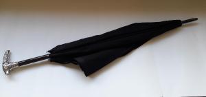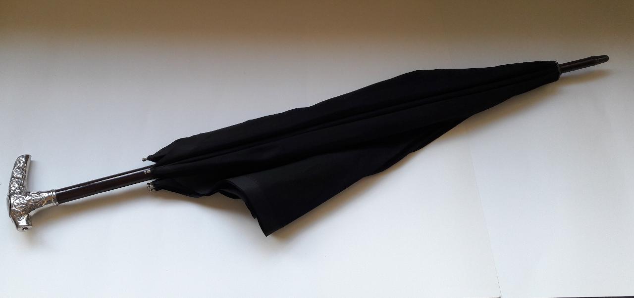 Ombrello con manico in argento sbalzato ornato con motivi decorativi vegetali: l'impugnatura presenta un piccolo sportello che si apre a scatto premendo un piccolo bottone e all'interno nasconde un vano.\nLungo il bordo del baldacchino si ripete in senso modulare la scritta "Garantito".