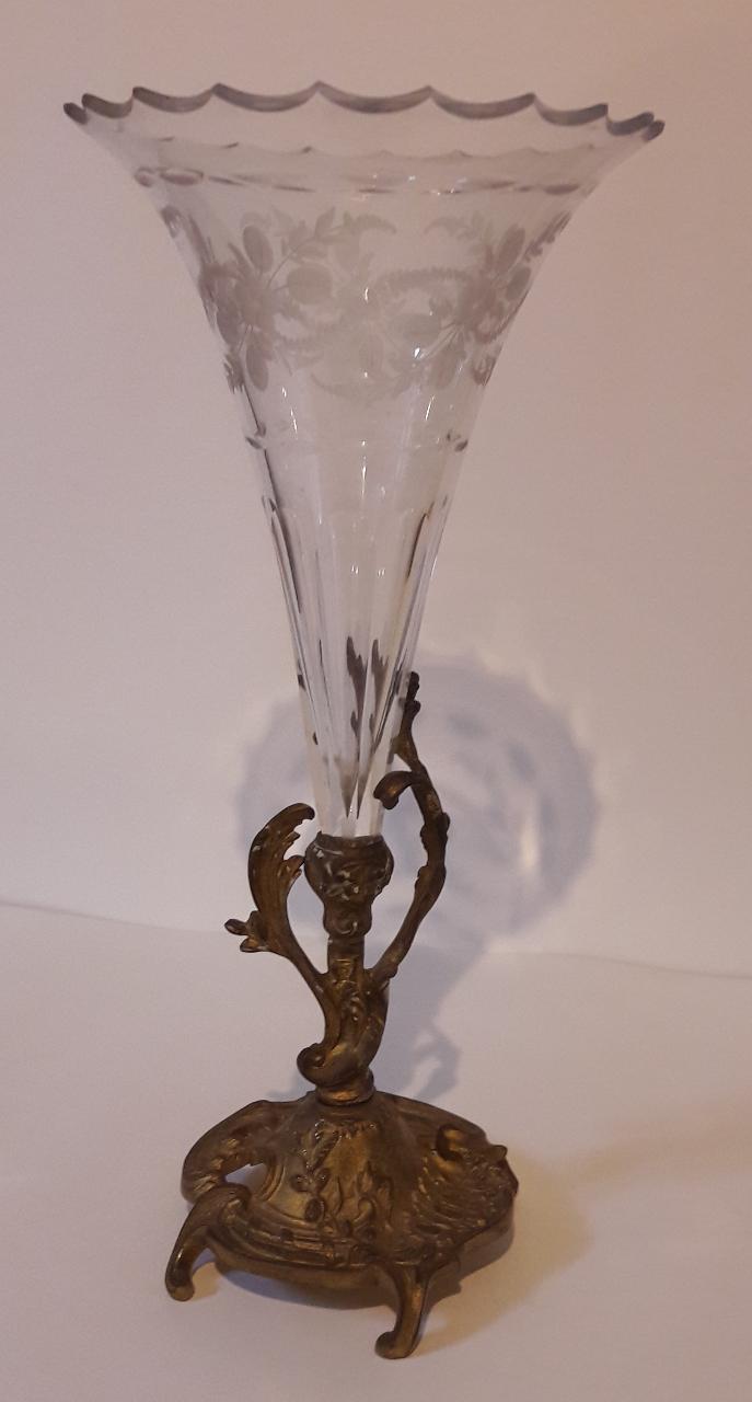 Coppia di vasi con base in antimonio dorato, decorata con elementi vegetali; corpo a calice in cristallo molato, sfaccettato nella parte inferiore, bordo superiore smerlato, fascia ornamentale con motivi decorativi floreali. \n