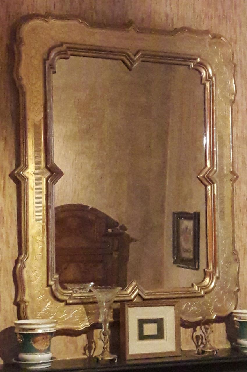 Specchiera a cabaret in legno dorato e lavorato al bulino con motivi decorativi vegetali; cornice sagomata ornata da modanature.