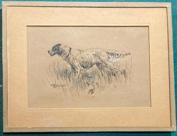 Disegno a inchiostro di china su carta da disegno ocra, con correzioni a tempera bianca. Montaggio all'europea, cartone al verso e vetro al recto con sigillatura perimetrale con nastro gommato decorativo.\nRaffigura un cane di profilo rivolto verso sinistra; da notare la resa accurata e veritiera del pelo animale con la sua naturale morbidezza.